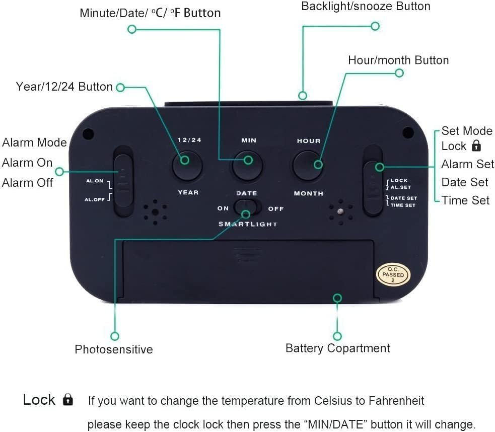 Clock with Intelligent Control: Alarm Once the configuration is complete, use the single button at the top to operate your alarm clock. The standard press to activate the high brightness backlight and snooze function. The process is straightforward, Third-party 3xAAA batteries not included.
