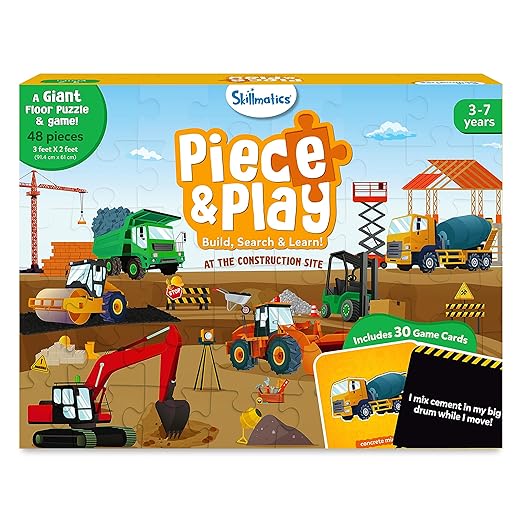 FLOOR PUZZLE & GAME: Piece & Play is a giant floor puzzle and a game, all in one! Assemble the puzzle and learn about all that goes on at a construction site with a search & find game that has 2 ways to play!
